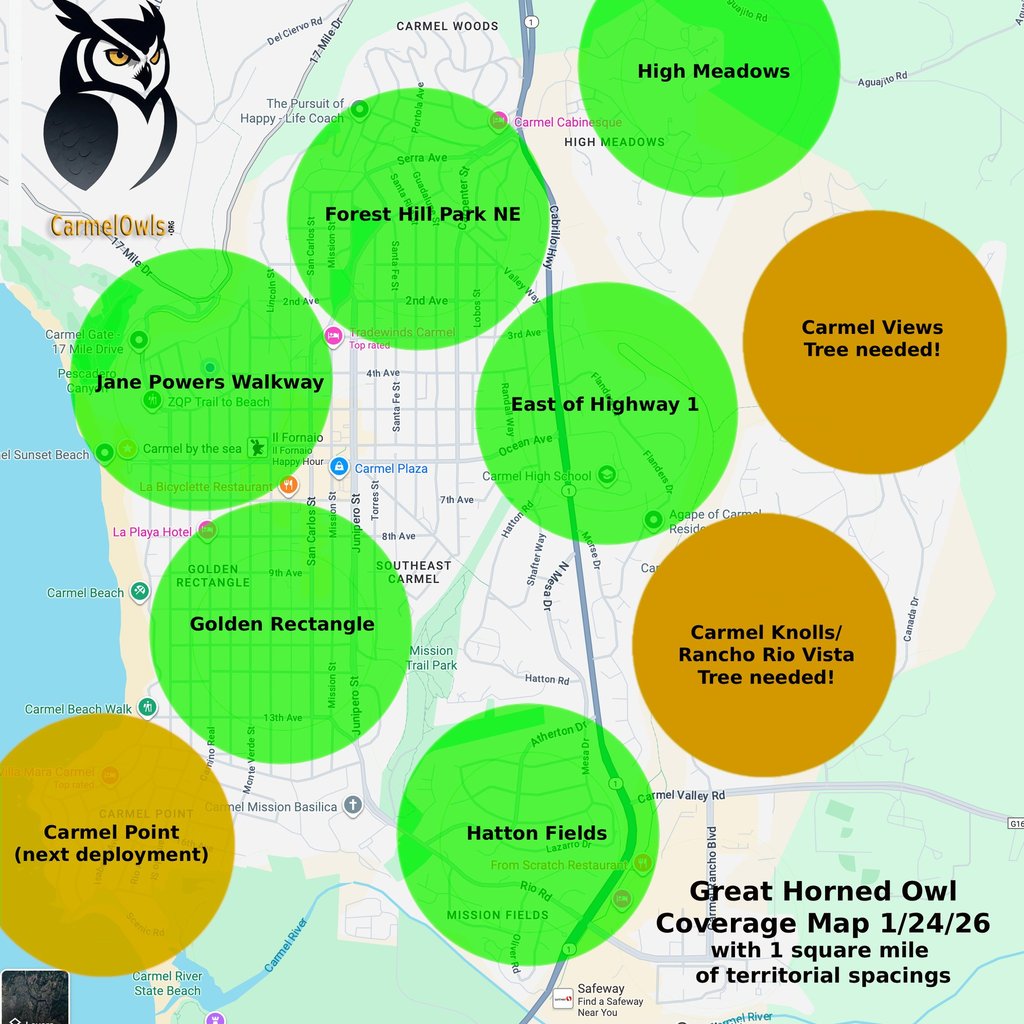 Phase 1 of the Great Horned Owl platform installation covers Carmel-by-the-Sea and parts of Carmel with six platforms installed on January 24th, 2026.