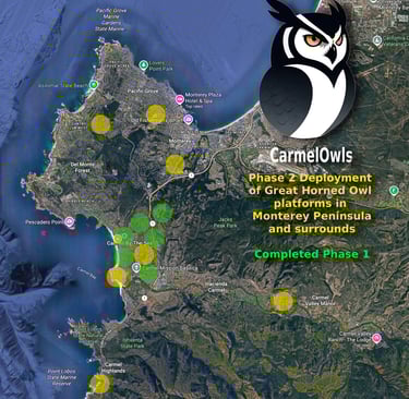Subsequent platform deployments will extend to Carmel Knolls, Rancho Rio Vista, Carmel Views, Carmel Highlands, Pebble Beach, Pacific Grove, and Monterey. Carmel-by-the-Sea is now fully populated with owl platforms.