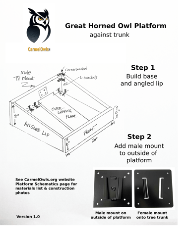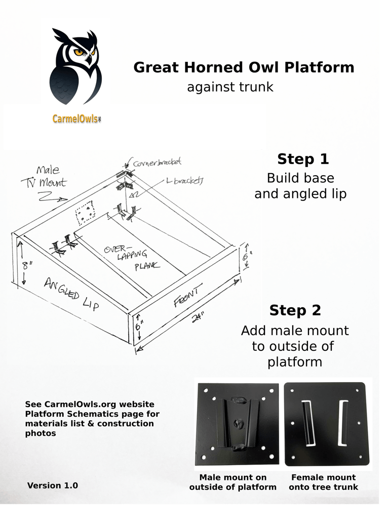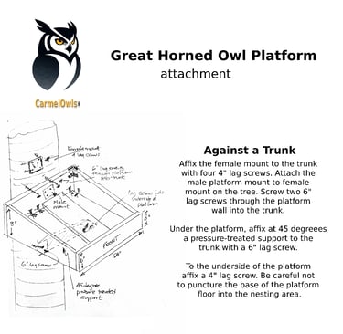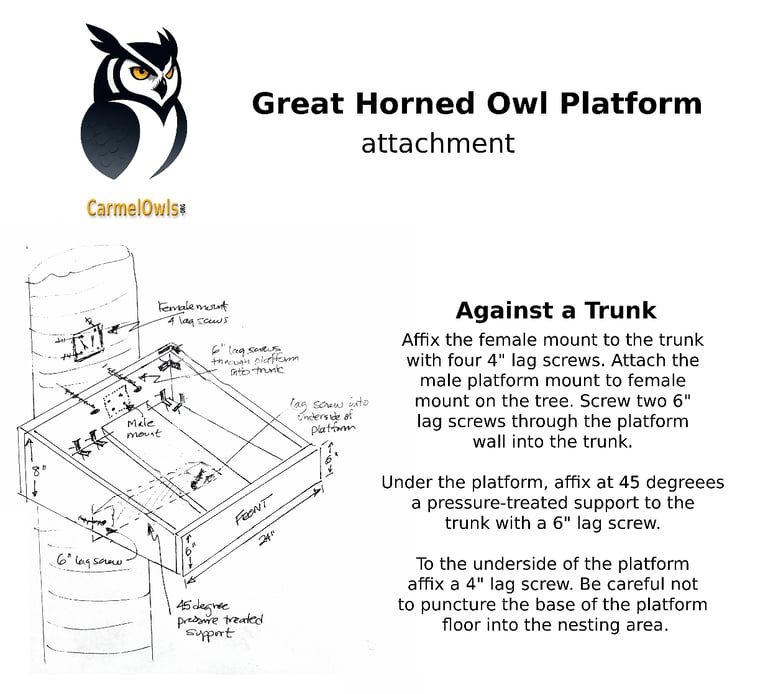 A pressure treated and stained 4" by 4" length of wood cut at 45 degrees is mounted to the trunk and under the platform base with a 6"* and 4" lag screw respectively for additional support. Careful that the 4" lag screw does not protrude into the floor of the owl platform.