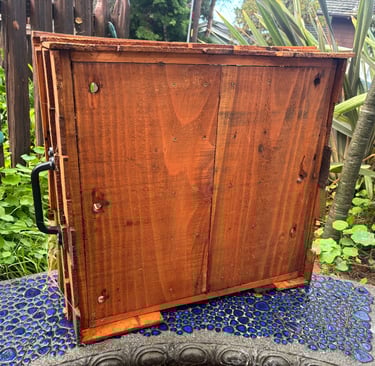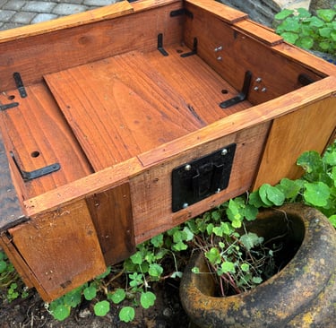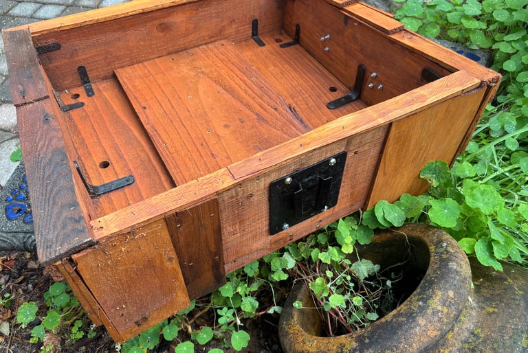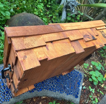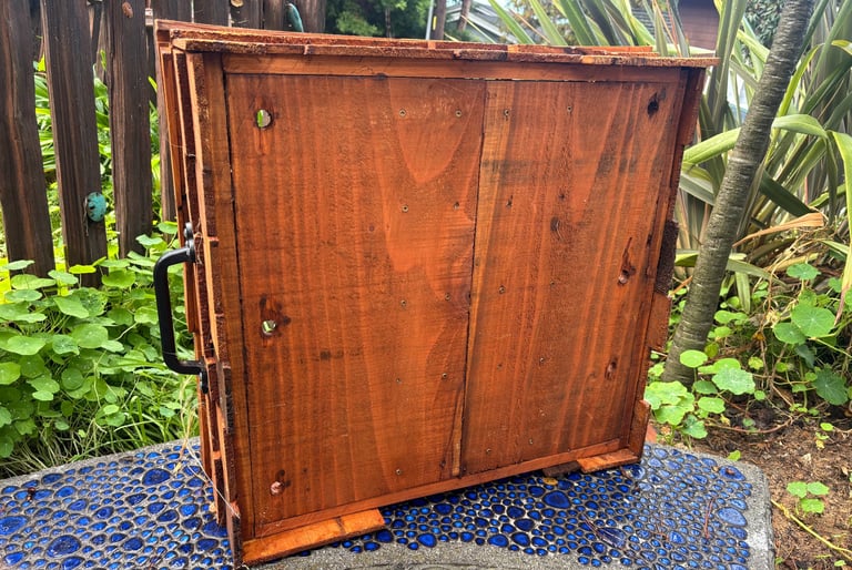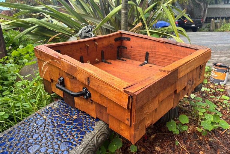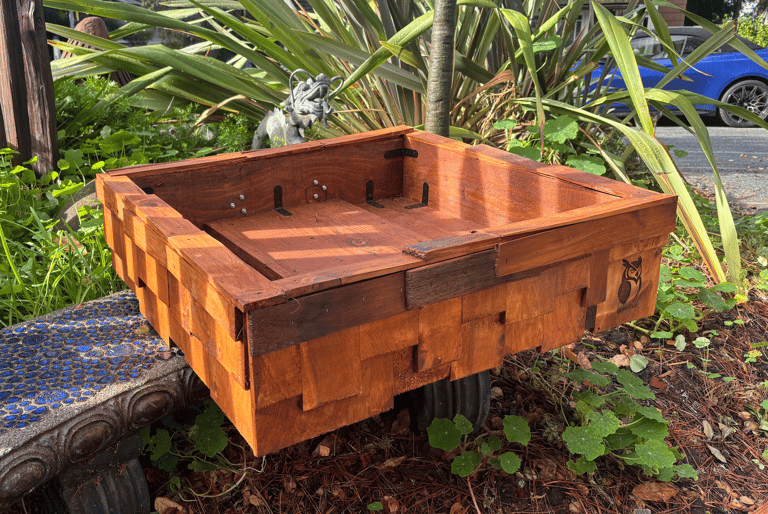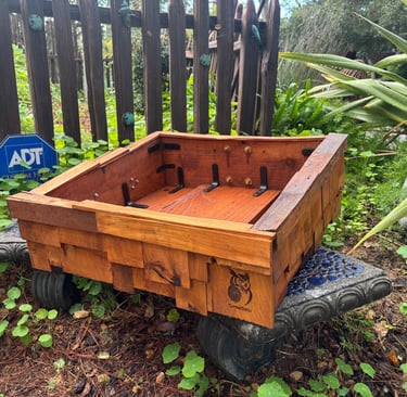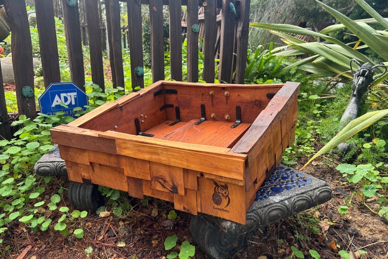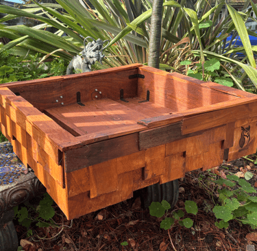This 2 ft square platform is made with three (3) 12" by 6 ft redwood planks from Home Depot. There's a center plank for strength with a 8 to 6" lip around the perimeter.