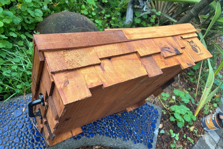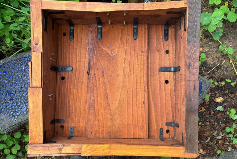Star drive wood screws with corner and floor L brackets give it strength. Cedar shingles around the perimeter give it a nice look while a transparent stain (not paint, which would be poisonous for the owls) preserves the wood.