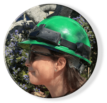Diana serves as the Traffic Crew Officer for Carmel Owls, ensuring traffic flows safely around owl platform installations while the cherry picker and crew work roadside. She monitors approaching vehicles from both directions—typically at least 150 feet depending on vehicle speeds, and significantly farther when operating near Highway 1 or while towing the picker between sites. Diana also wears a second safety hat as the Boom Bucket Observer, carefully watching the bucket's movement to help the operator avoid overhanging branches or hidden limbs that could pose hazards during installation. Her vigilance on the ground and eyes on the boom help keep both the crew and passing motorists safe during each platform deployment.