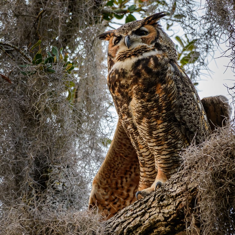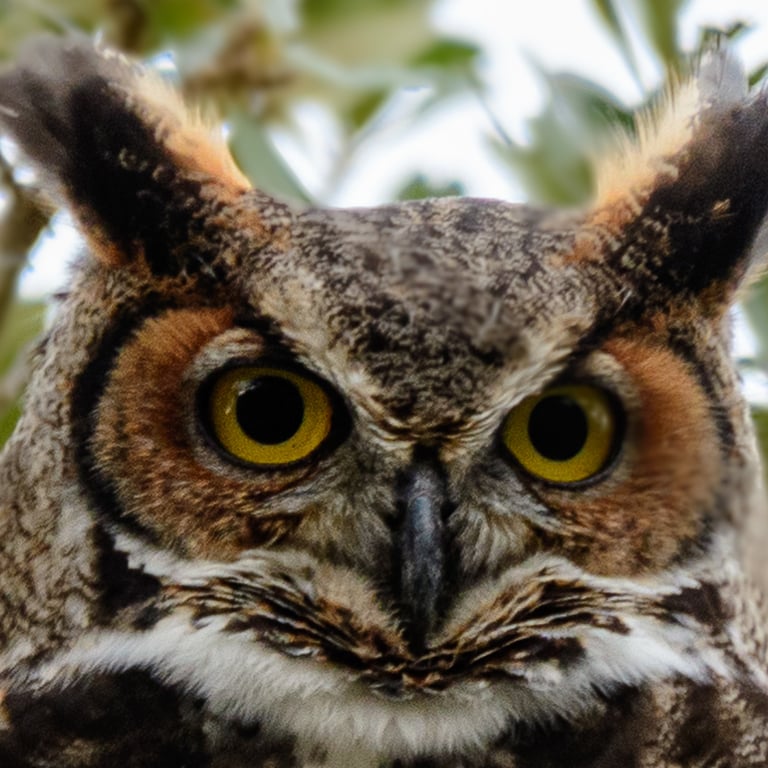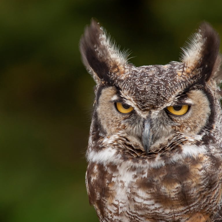 They have excellent night vision and hearing, and are able to rotate their heads up to 270 degrees to see and locate prey. Great Horned Owls are known for their deep 'hoo-HOO' calls used for territorial defense.
