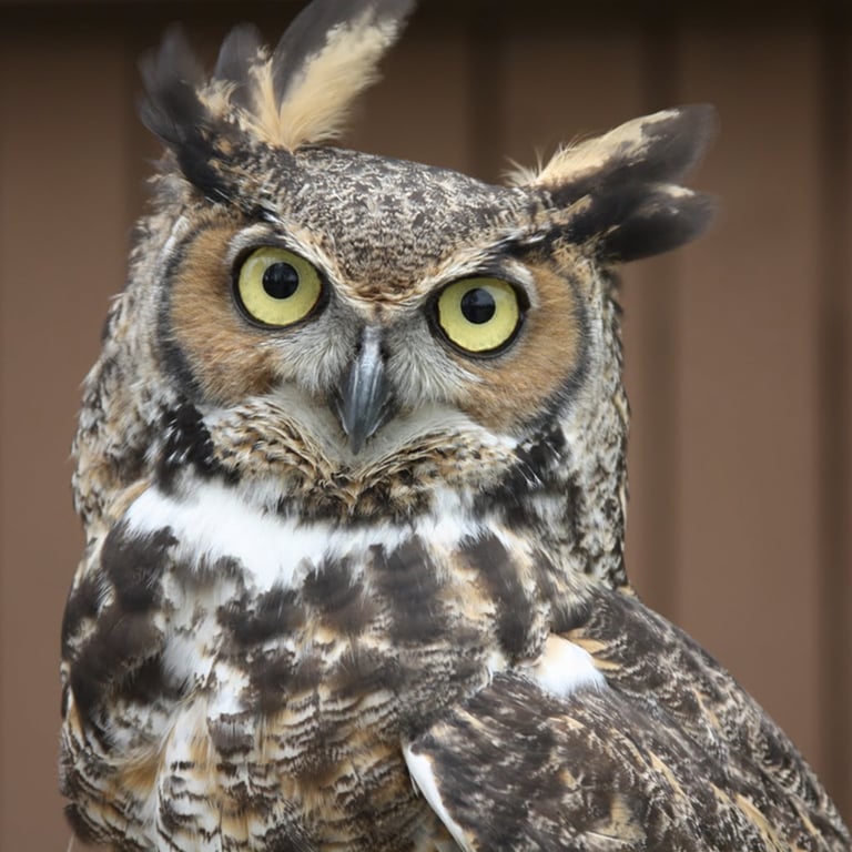 The Great Horned Owl is a large, common North American owl known for its distinctive feather tufts or 'horns', silent flight, and powerful hunting and preying skills predating a wide variety of rats and other rodents.